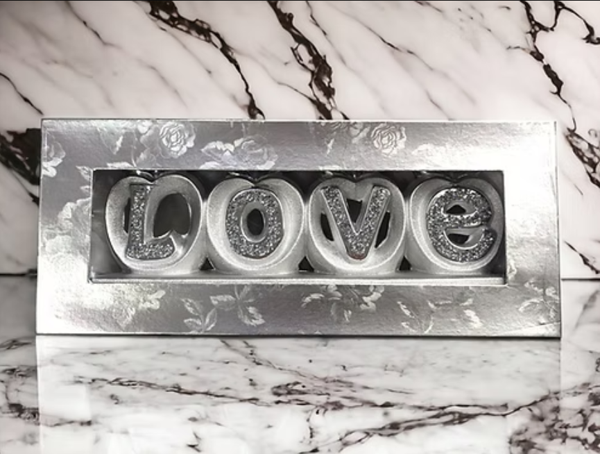 Gift-Ready Packaging: Your Silver Crushed Diamond "LOVE" Ornament arrives in a stylish gift box with a silver lid and a sleek black exterior. This packaging not only ensures the safe delivery of your cherished piece but also makes it an ideal gift for weddings, anniversaries, birthdays, or any occasion celebrating love.