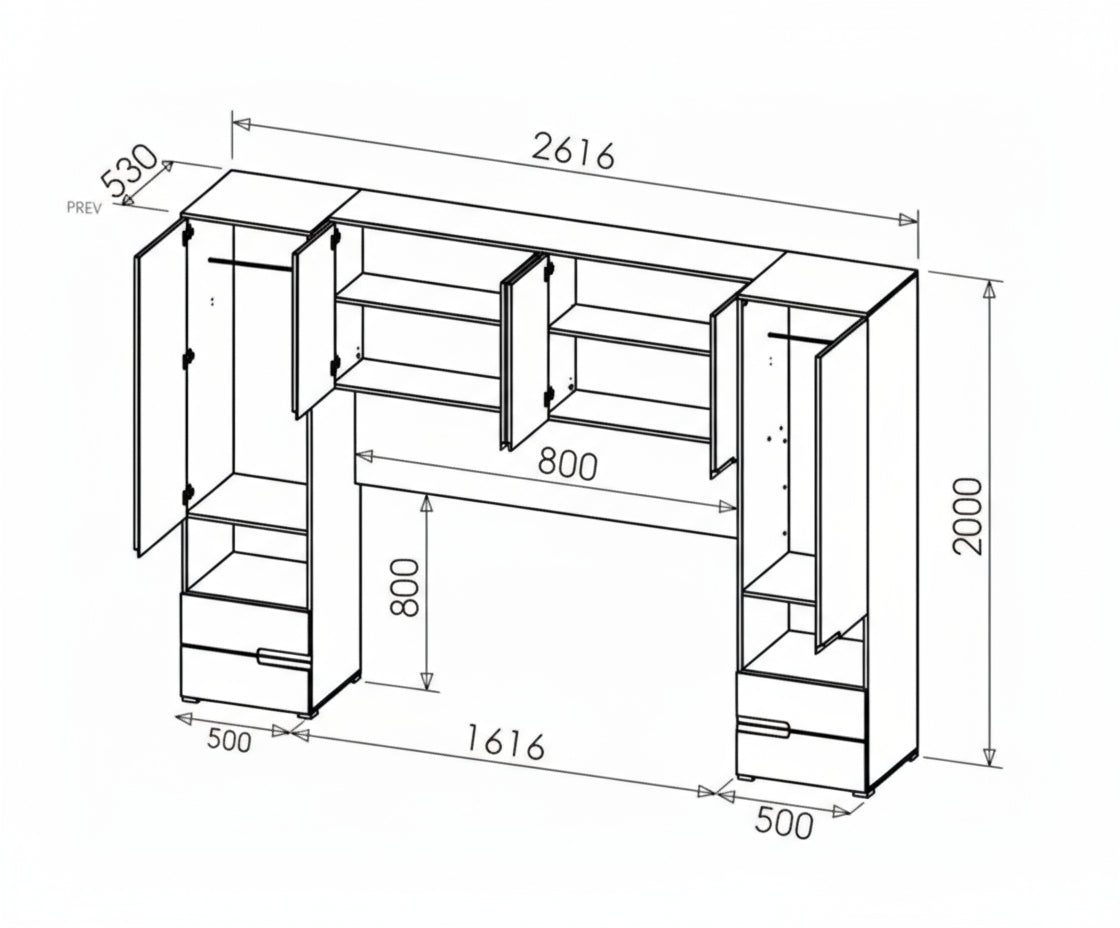Spacious storage: Multiple overhead cupboards and tall side units for clothes, bedding, or décor.